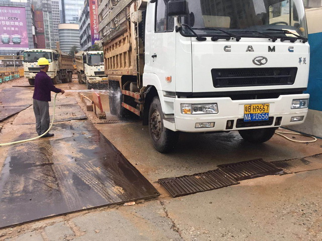 三、設(shè)置車輛沖洗設(shè)施,安排專人對出場車輛進(jìn)行沖洗,防止污染市政道路。